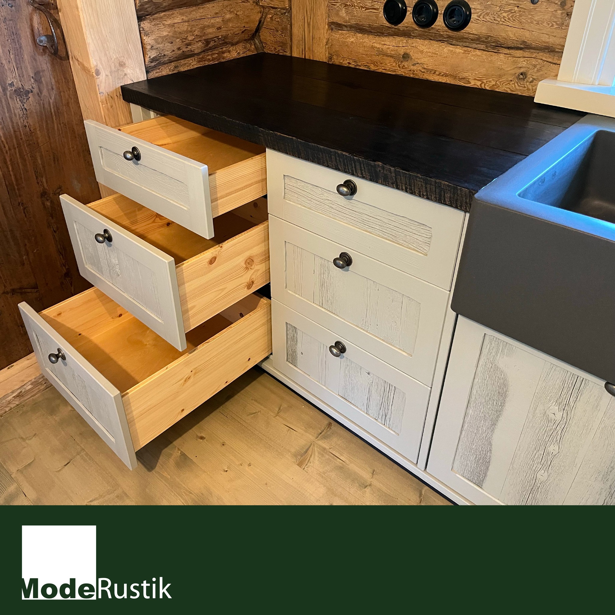 • Raamuksed harjatud ja  kulutatud ristkihtpuidust  siseetahvlitega. Vanandatud  tammest tööpinnad.
