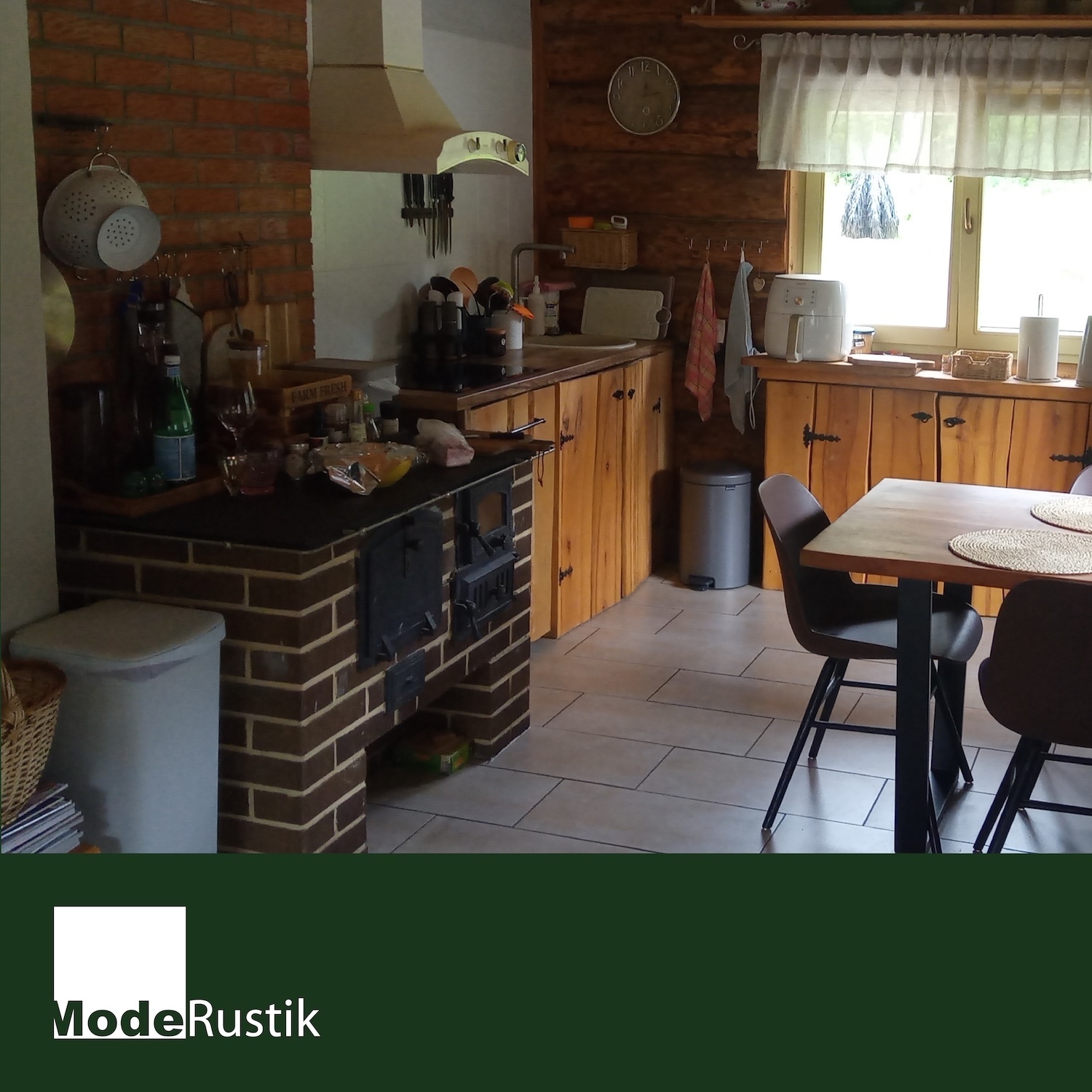 • Suitsusauna stiilis, saejälgedega köögimööbel ja trepp.